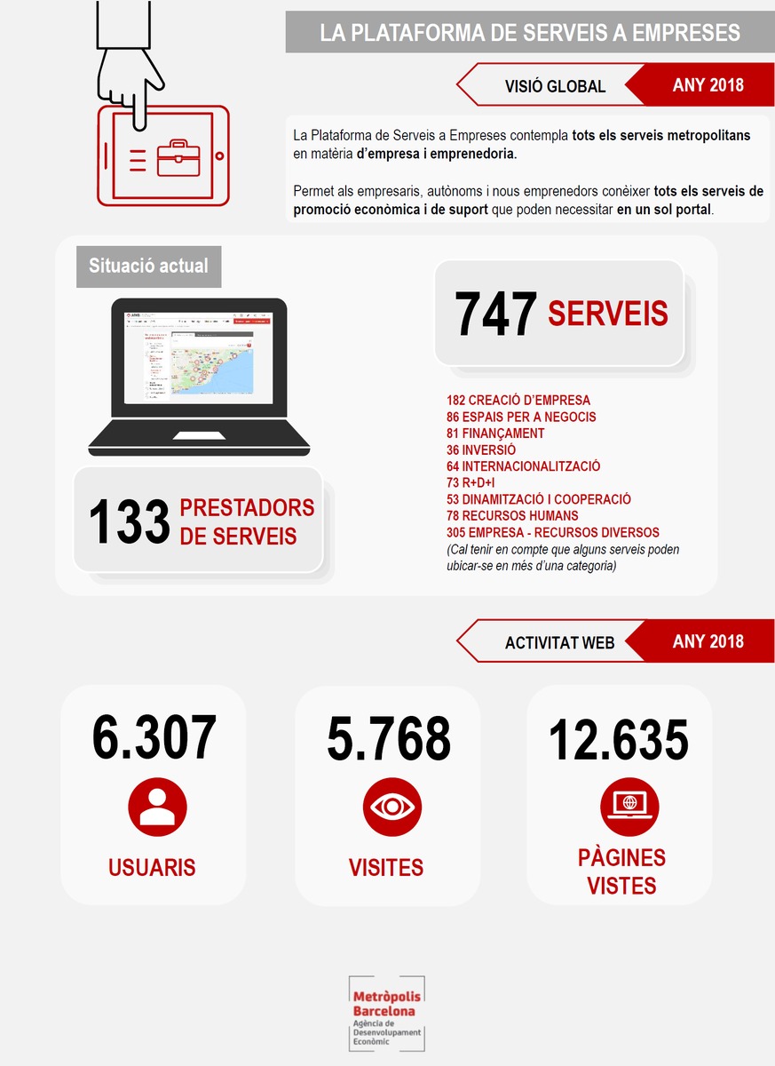 - Buscador de servicios a empresas. Se trata de un aglutinador de los varios servicios y prestamistas de servicios del ámbito metropolitano, y se estructura como una plataforma informativa y actualizada. Participan los 36 municipios y otras administraciones, hasta un total de 132 entidades y/u organismos, con un total de 751 servicios reflejados, una media de aproximadamente 600 visitas mensuales y 150 registros actualizados.