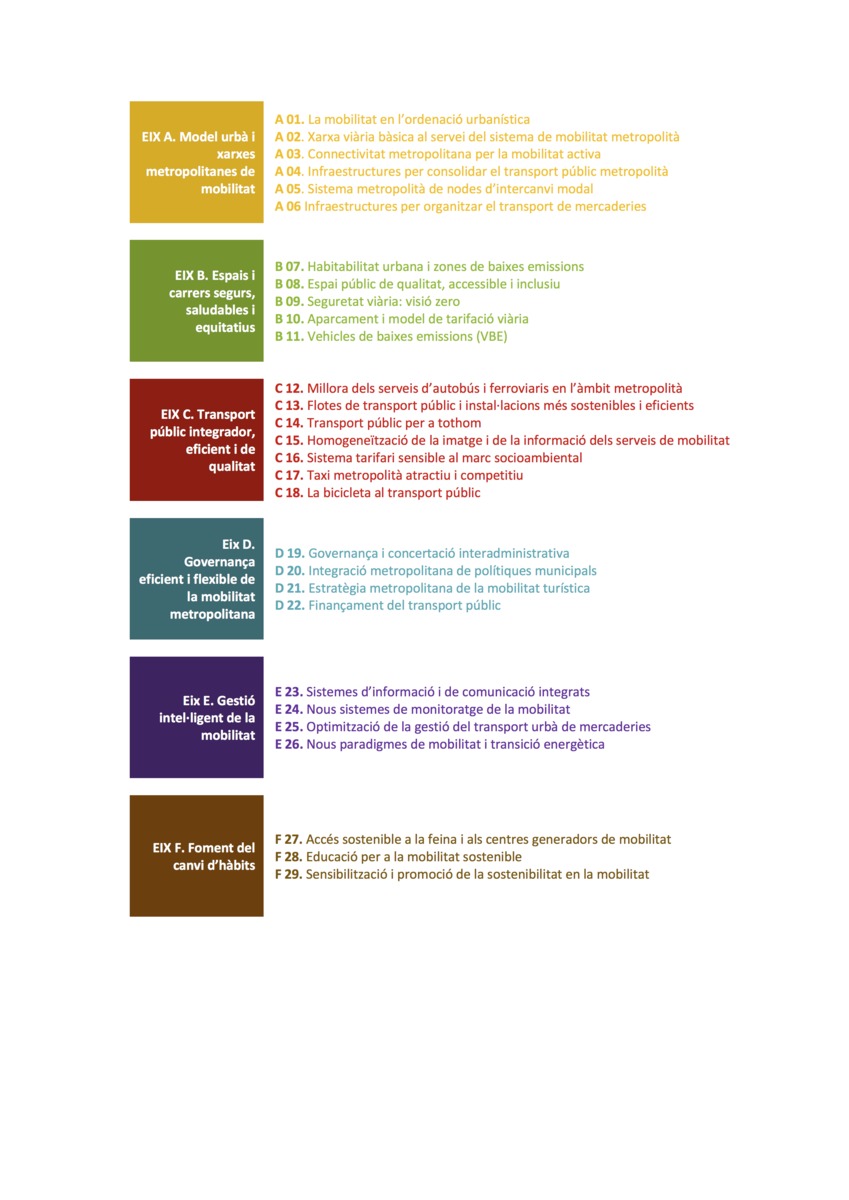 La proposta del PMMU s'ha estructurat en 6 eixos estratègics, 29 línies estratègiques i 103 mesures. Els eixos i les línies estratègiques que es descriuen a continuació expliquen les mesures del Pla en el marc d'una visió que servirà de referència per al desenvolupament de les polítiques metropolitanes de mobilitat en els propers anys. Pla metropolità de mobilitat urbana (PMMU)